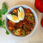 This savory Tunisian-inspired chickpea salad packs in the flavor with olives, tangy capers, roasted bell peppers, and hard-boiled eggs. A tomatoey harissa dressing, spiced to taste, brings the salad together for a delicious result. Serve this salad cold and pair it with some crusty bread and cheese, grilled meats, and/or a green salad. This is a great summer salad. We make it almost every year!